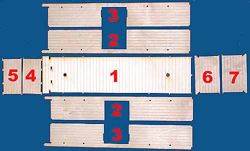 Unter der Bühne wird dann die Pufferbohle ergänzt. Weiterhin werden die 2 Streifen mit den Löchern mit 8 mm Durchmesser unter den Wagenboden angeklebt. Dort setzt man später die 2 Drehbolzen für die Drehgestelle ein. Wer später den Wagenboden nicht mit Messingprofil gestalten will, kann zwecks Erhöhung der Stabilität die mitgelieferten Querstege unterleimen, allerdings sollte dabei die Beweglichkeit der Drehgestelle beachtet werden. |