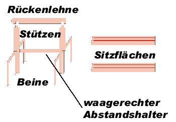 einfach, siehe Skizze. Zu beachten ist: Die abgerundete Seite der Rückenlehnen zeigen immer Richtung Fahrzeugmitte, die rechtwinkligen zur Wagenwand. Jede Bank besteht aus 2 dreibeinigen Seitenteilen, 2 senkrechten Stützen mit Aussparungen für die Beine, zwei Sitzflächen, 1 Abstandshalter und 1 Rückenlehne. Zweisitzige Doppelbänke waren 3 in den Wagen, statt der 4. steht ja der Ofen am Wagenende. Die Bänke an den Stirnseiten sind natürlich keine Doppelbänke. Die Zahl der Teile ist reichlich bemessen. Die Kleinteile, welche auf dem Photo neben den Sitzen liegen, blieben bei dieser Bestuhlung übrig. Als Klebstoff wurde UHU Hart verwendet. Die Art der Farbgebung sollte jeder für sich selbst entscheiden. Vor einer Einfärbung empfiehlt es sich die Verbindung an der Rückenlehne zu spachteln und anschließend glatt zu schleifen. |